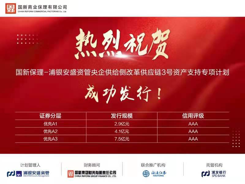 近日,国新商业保理有限公司成功发行“国新保理-浦银安盛资管央企供给侧改革供应链3号资产支持专项计划”,发行规模15.27亿,其中优先级规模14.50亿,信用评级均为AAA级。